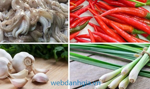- Bước 1: Bắt đầu chế biến món ăn đơn giản tại nhà này từ việc sơ chế bạch tuộc. Bạn chà xát với muối để khử tanh. Tiếp đến, cắt bạch tuộc thành những miếng nhỏ vừa ăn tùy sở thích. Sả, ớt và tỏi đều cần rửa sạch, băm nhỏ.