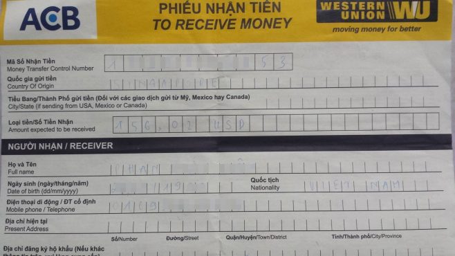 Hoàn thành hai bảng câu hỏi trên, nhân viên ngân hàng sẽ giao tiền mặt cho bạn chỉ sau 5 phút. Bạn sẽ không phải mất thêm khoản phí nào khi nhận tiền. Bạn có quyền nhận VND hoặc USD theo tỷ giá hối đoái tại thời điểm nhận. Bạn có thể yêu cầu thay đổi yêu cầu tổng quát trong thời gian càng sớm càng tốt nếu phát hiện có sai sót. Bạn có thể hỏi trợ giúp để biết tình hình nhận tiền qua điện thoại từ đơn vị nhận tiền để biết khi nào, ở đâu cho người nhận nắm bắt thông tin.