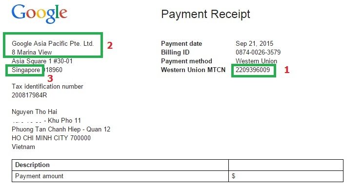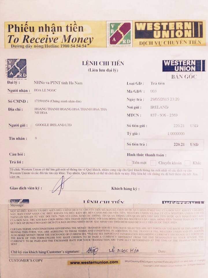Hình ảnh trên là một ứng dụng phổ biến của Google Adsense gửi tiền cho các đối tác của mình thông qua Western Union. Qua đó, bạn cần lưu giữ và bảo mật 3 thông tin được khoanh màu xanh.