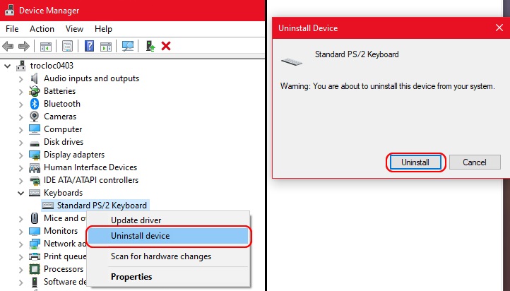 Bước 3: Nhấp chuột phải vào mục Bàn phím > Gỡ cài đặt thiết bị. Sau đó chọn Gỡ cài đặt để nhận dạng.