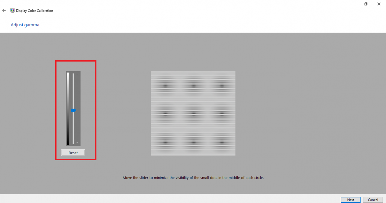 Bước 3: Tại mục Adjust gamma, các bạn tiến hành chỉnh màu màn hình windows 10 bằng cách kéo thanh trượt lên xuống để chấm tròn gần như biến mất, hoặc căn chỉnh sao cho phù hợp với hình ảnh Good gamma ở phần trước.