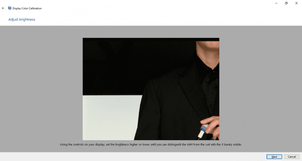 Bước 4: Sau khi điều chỉnh xong, các bạn bấm “Tiếp theo’ để đến phần Điều chỉnh độ sáng để điều chỉnh độ sáng. Ở bước này, bạn cần sử dụng bảng điều khiển màn hình để cân bằng màu ảnh sao cho hình ảnh áo và chữ X được rõ ràng và đều màu nhất.