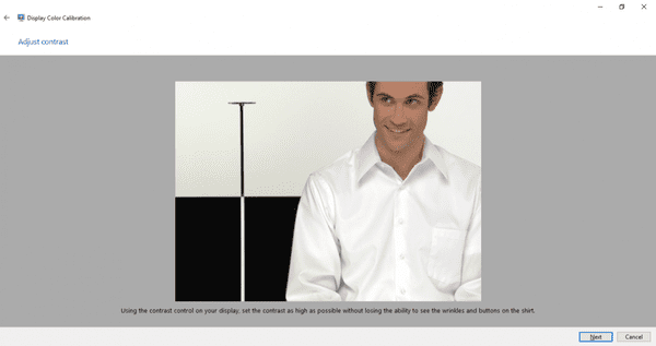 Bước 5: Xong, nhấn Next để đến cửa sổ điều chỉnh độ tương phản Contrast. Ở bước này bạn cũng sử dụng bảng điều khiển màn hình để điều chỉnh sao cho hình ảnh giống với biểu tượng Good Constrast ở bước trước. Sau khi chỉnh sửa xong, nhấp vào nút Tiếp theo.