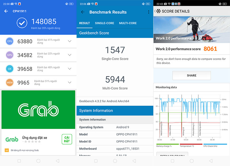 Tóm tắt nhanh cấu hình của OPPO F11 sử dụng Chip Helio P70, RAM 6 GB và bộ nhớ trong 64GB. Đầu tiên vẫn là phần đánh giá hiệu năng quen thuộc với ba phần mềm Antutu, Geekbench và PCMark.