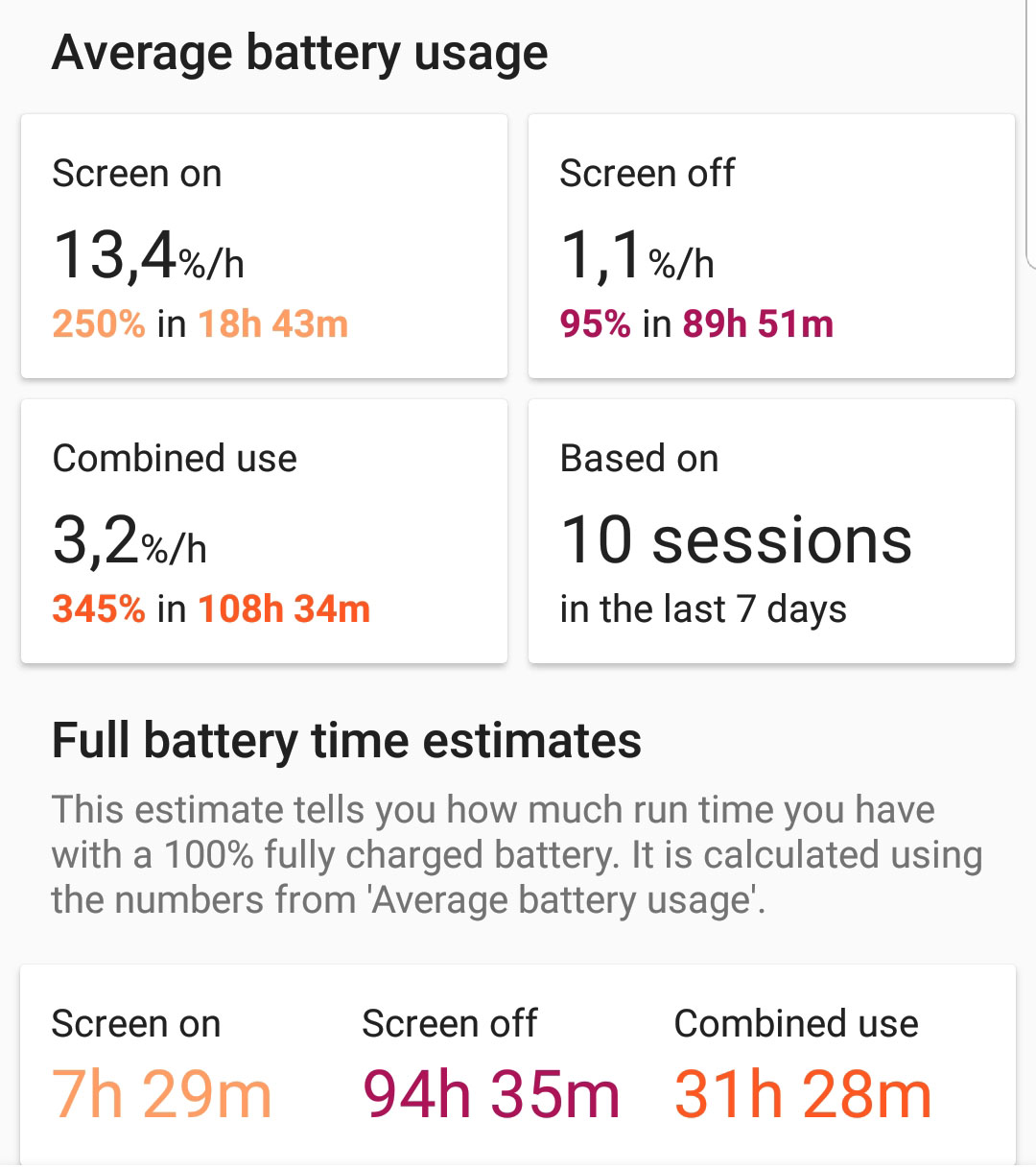 Thực tế sử dụng trong vòng vài tuần, theo báo cáo của ứng dụng AccuBattery Pro, Note 9 sụt 13,4% pin trên màn hình lúc 01 giờ sáng và 1,1% mỗi giờ ở chế độ chờ sau khi không sử dụng. Do đó, trung bình, mỗi ngày máy đáp ứng được 7,5 giờ thời gian màn hình.