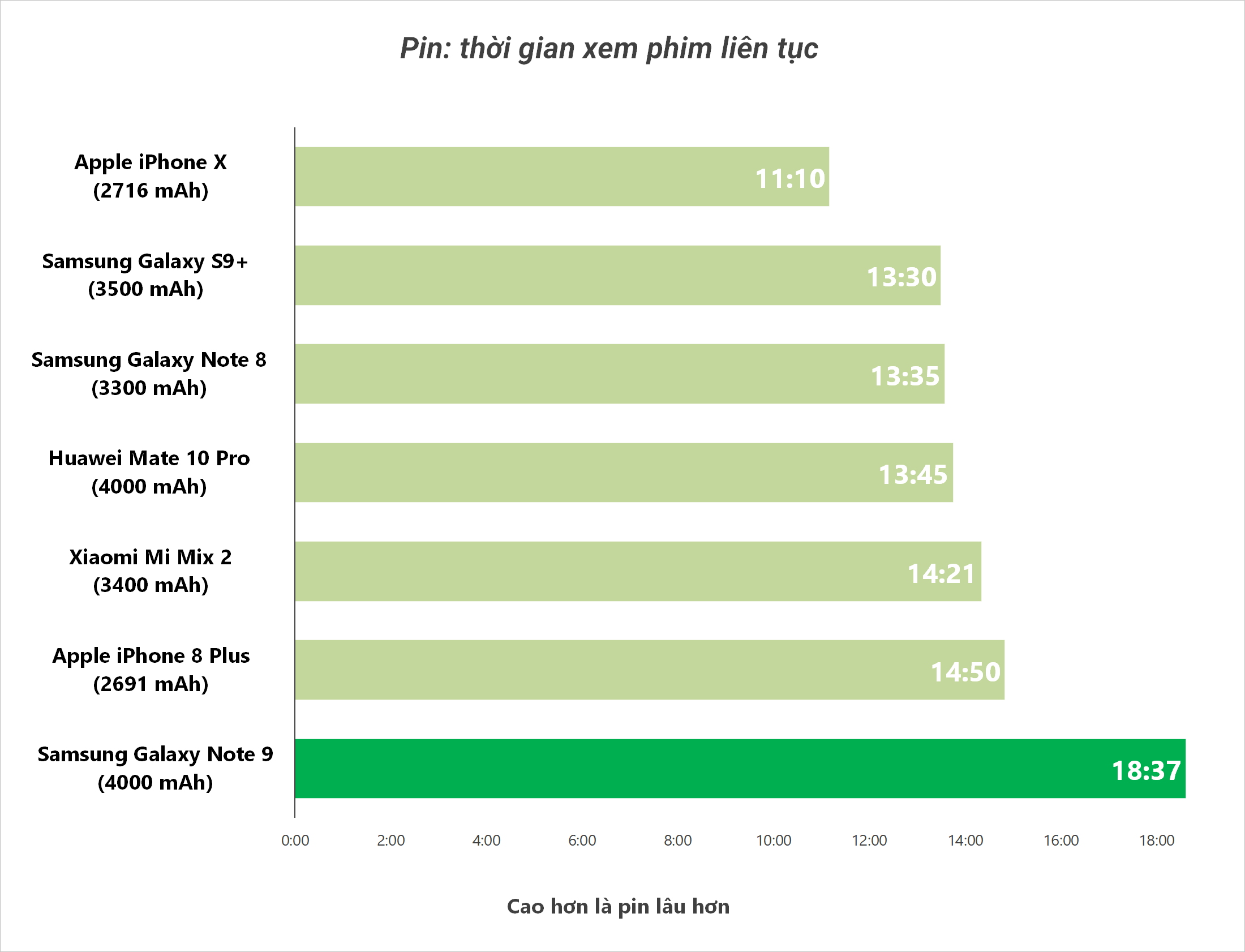 Trong thử nghiệm của chúng tôi, Note 9 mất tổng cộng 1 giờ 48 phút để sạc đầy viên pin 4000 mAh của sản phẩm đi kèm. Trong đó, 36% lượng điện được sạc trong 30 phút đầu tiên, và 70% lượng điện được sạc trong 1 giờ.