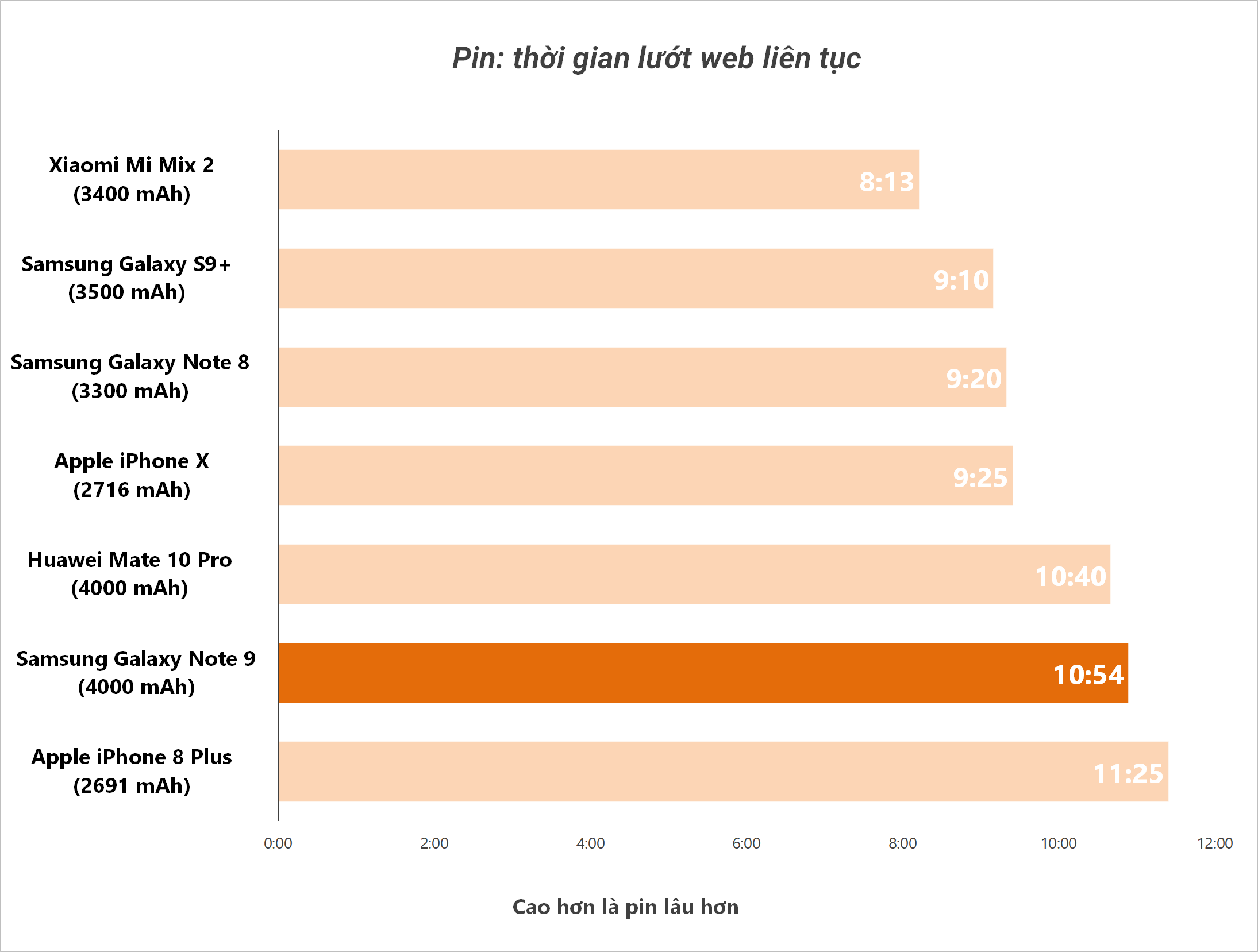 Các thử nghiệm về thời gian lướt web thời lượng pin được tính từ 100% xuống còn 10%, và sau đó dừng lại tại 70% độ sáng màn hình