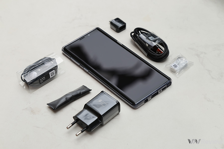Phụ kiện đi kèm Note 9: sạc nhanh, cáp dữ liệu USB Type C, tai nghe và bộ chuyển đổi USB OTG.