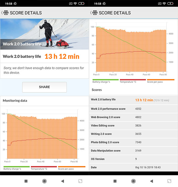 Khi kiểm tra pin của Redmi 8 bằng ứng dụng PCMark, kết quả cho thấy máy có thể hoạt động liên tục hơn 13 giờ.
