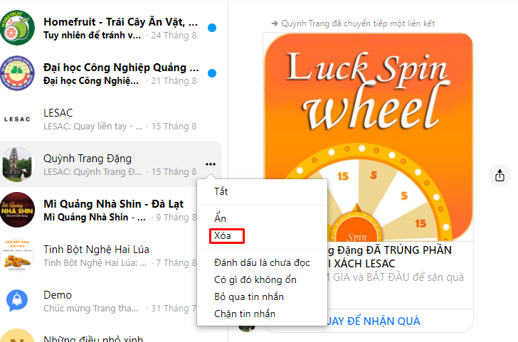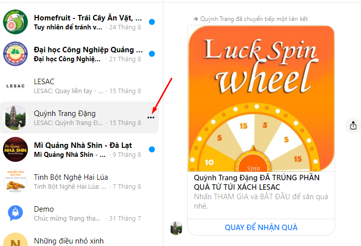 - Bước 1: Truy cập vào giao diện Messenger trên máy tính của bạn. Có thế là trên web browser hoặc tải ứng dụng Messenger. Sau đó tìm đến cuộc trò chuyện tin nhắn người dùng muốn xóa và di chuột vào cuộc trò chuyện đó sẽ xuất hiện 3 dấu chấm ngang.
