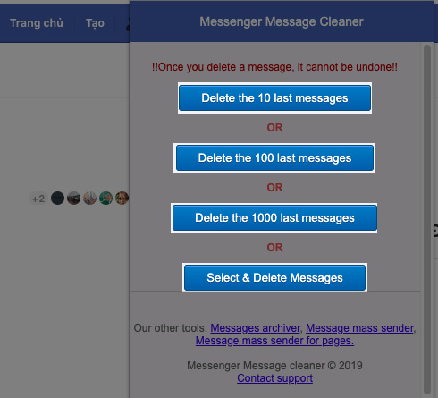 - Bước 4: Đăng nhập vào giao diện Messenger rồi nhấn vào biểu tượng Messenger Cleaner thì bạn sẽ thấy thông báo có 2 tùy chọn: